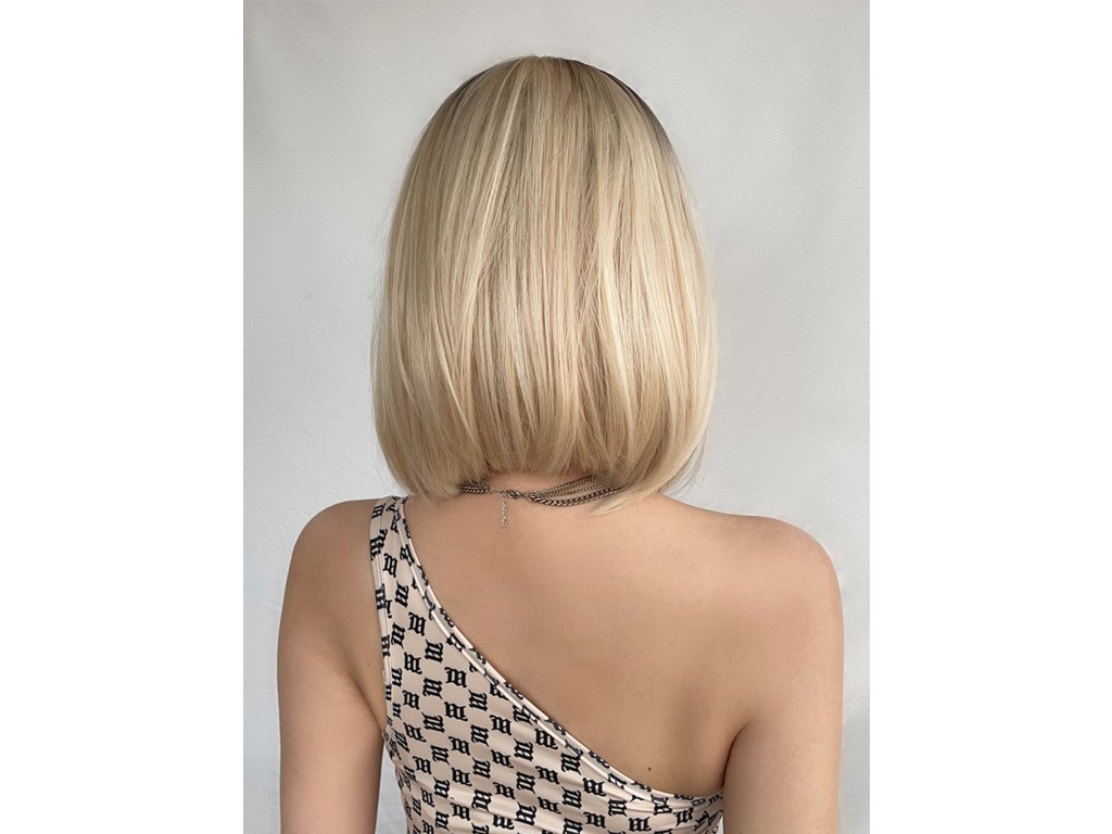 Krásna krátka parochňa v blond farbe s tmavými korienkami. Rovné vlasy so zaujímavým strihom. Je vyrobená z kvalitného syntetického vlákna, ktoré je veľmi príjemné na dotyk a jemnosťou pripomína ľudské vlasy.