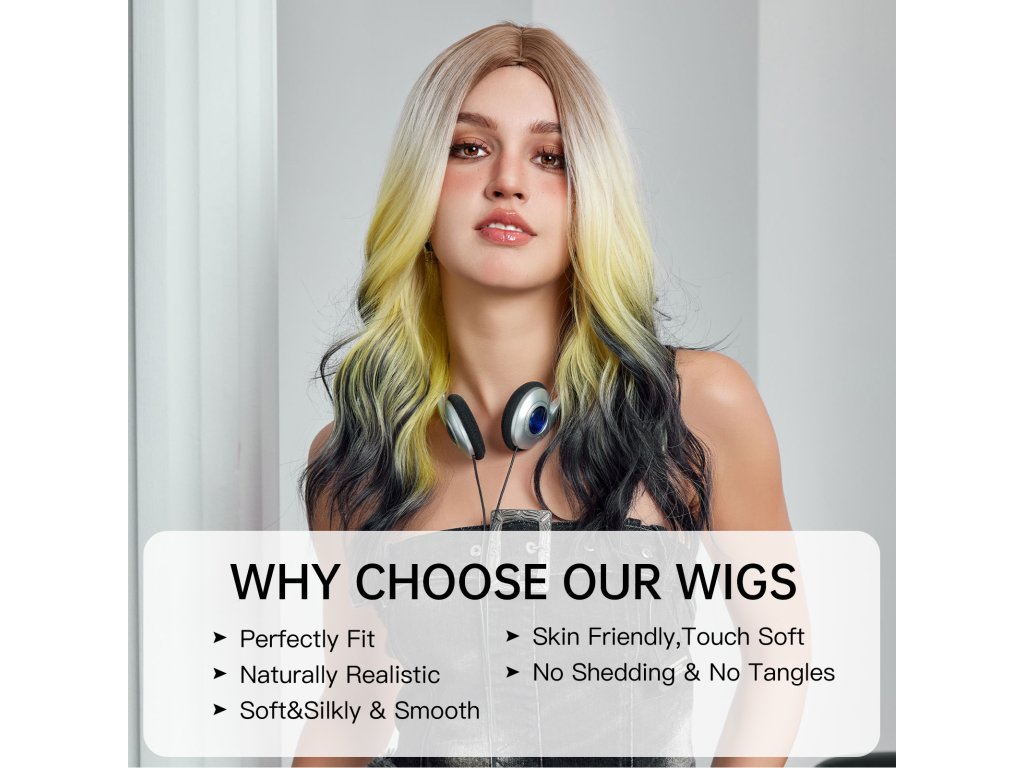 Pôsobivá farebná parochňa v kombinácii žltej, blond a čierne farby. Vlnité stredne dlhé vlasy. S touto parochňou zaručene zažiarite na každej párty!