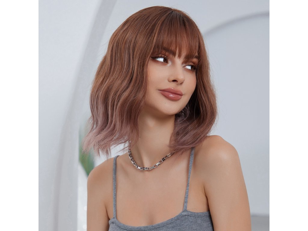 Krásna parochňa vo svetlohnedej farbe s ružovkastými končekmi a úžasnou ofinou. Krátke vlnité vlasy v mikádo strihu. Je vyrobená z kvalitného syntetického vlákna, ktoré je veľmi príjemné na dotyk a jemnosťou pripomína ľudské vlasy.