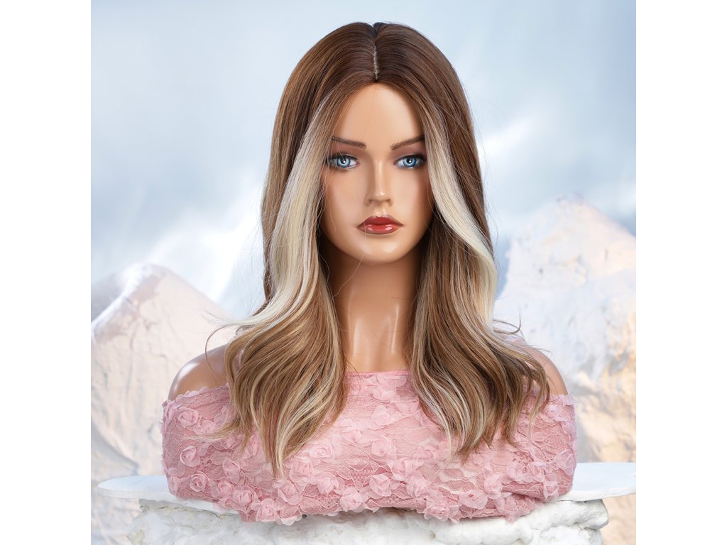 Krásna svetlohnedá parochňa s blond melírom okolo tváre. Stredne dlhé vlasy s jemnými vlnami. Je vyrobená z kvalitného syntetického vlákna, ktoré je veľmi príjemné na dotyk a jemnosťou pripomína ľudské vlasy.