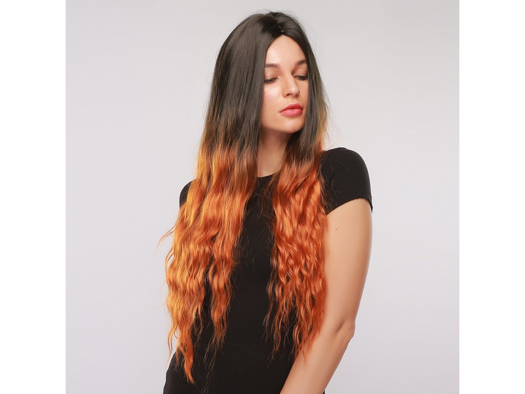 Krásna vlnitá parochňa v čiernej farbe v ombré štýle s hrdzavými koncami. Je vyrobená z kvalitného syntetického vlákna, ktoré je veľmi príjemné na dotyk a jemnosťou pripomína ľudské vlasy.